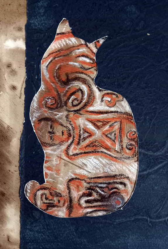 This #Caturday Saturday, my negative silhouette of little rescue cat Bill shows a drawing I did a few years back of a carved stone in the little church in Llanrhidian on The Gower Peninsula. I cut the image of Bill from some very heavy textured paper that I recycled, I painted it black and started to experiment with it. I’m enjoying the process, creating so many different images with some quite basic materials.
