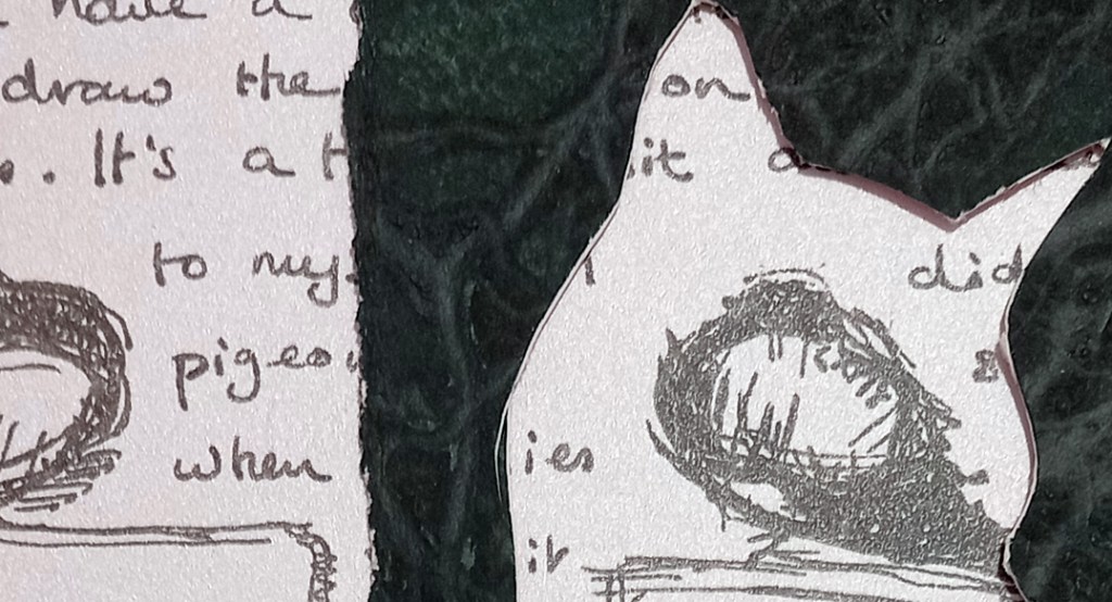 This #Caturday Saturday, here is my silhouette of little rescue cat Bill on top of a silkscreen print I did a few years back, based on a series of sketches I made of pigeons in Swansea. I like pigeons. I merged the drawings with some text I had written about the experience of drawing the pigeons, and turned the whole thing into a photographic screen stencil and printed it up in a pale pink and black. I cut the image of Bill from some very heavy textured paper that I recycled, I painted it black and started to experiment with it.