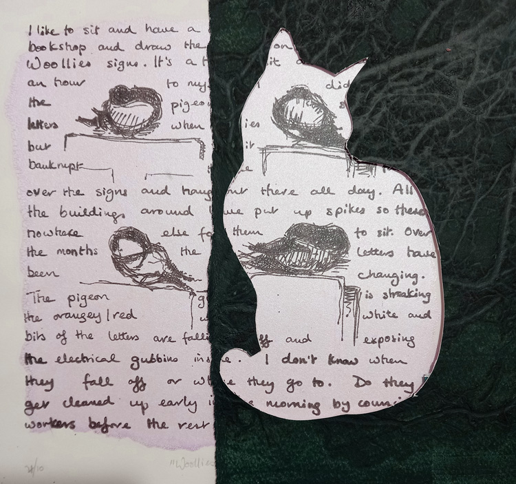This #Caturday Saturday, here is my silhouette of little rescue cat Bill on top of a silkscreen print I did a few years back, based on a series of sketches I made of pigeons in Swansea. I like pigeons. I merged the drawings with some text I had written about the experience of drawing the pigeons, and turned the whole thing into a photographic screen stencil and printed it up in a pale pink and black. I cut the image of Bill from some very heavy textured paper that I recycled, I painted it black and started to experiment with it.