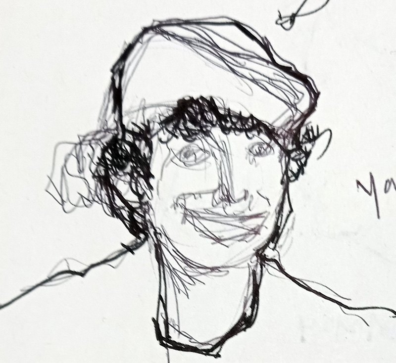 More scribbling from me, done last Saturday, which was the ancient festival of Imbolc. A friend had his birthday party at the yacht club and there were loads of musicians. This young man in the snazzy hat played drums. I think that hats are hard to draw, but at least he didn’t have a beard or specs.