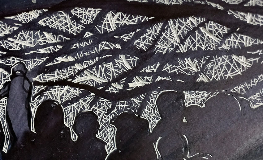 I’ve more or less finished carving the head of the Mari Lwyd in the foreground so today I gave some attention to the background. I wanted some detail in it, but not enough to compete with the Mari Lwyd. I wanted to have some light showing in the background but I didn’t want a solid white, I wanted to retain the sense of darkness, as this is based on some sketches I did at night at the Gower Wassail and Mari Lwyd celebration at Hen Galan.