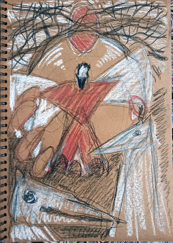 I’ve been mulling over an idea for ages, years, for a large woodcut or maybe a painting. I’ve been doing smaller pieces of work that have been independent of each other, but also try out elements of a potential larger artwork. Today I finally got off my bot and grabbed an A3 sketchbook (brown paper) and did some rough sketching with conte crayons. This is the first rough, no doubt there will be many more as I refine the composition and then the details, but this here is my starting point. I wonder how long it will take to get to the finishing point?