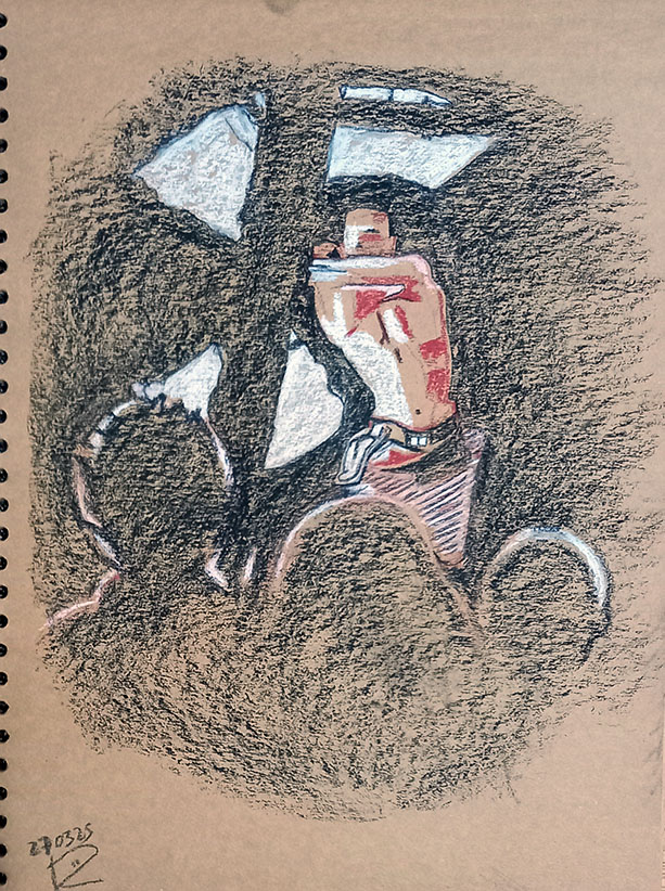 After trawling through photos and sketches, I’m getting stuck in to working out different bits of the composition. This is partly to get familiar with the details and partly to work out if this is what I want to go with. This is based on a photo I took of the spectacular fire spinner Ddraig Williams who will be a central figure in the finished work. I don’t know yet if it will be a big woodcut or a painting, maybe I’ll do both.