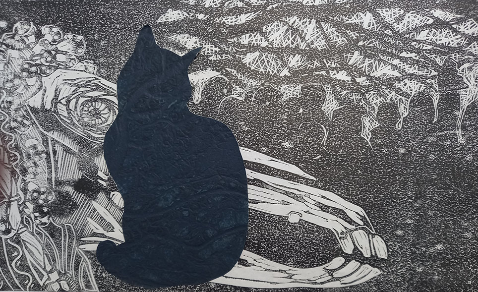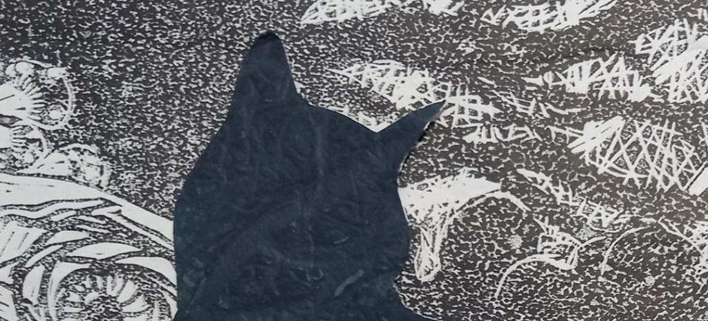 It’s #Caturday Saturday again and this week I have put the positive silhouette of Our Bill (the rescue cat) onto a rough proof print of my latest Mari Lwyd linocut. I find that with traditional grey lino, it can take one or two attempts to get a good print from a newly cut block, so I usually do a couple of proofs onto cheap paper – this is newsprint. I like it as the background for Bill’s silhouette though, the patchy greyness emphasises her image.