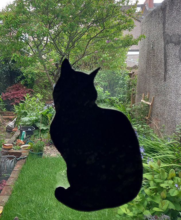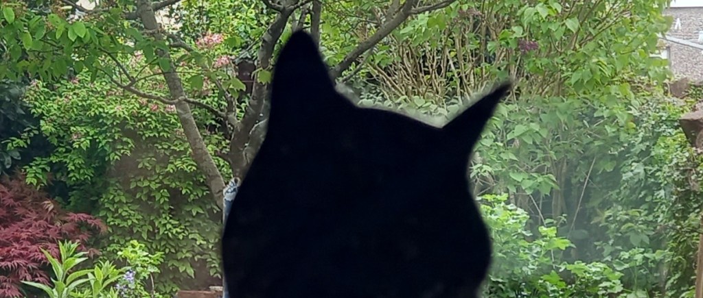 It’s #Caturday Saturday again and this week I stuck the positive silhouette of our little rescue cat, Bill AKA William ChatNoir, onto a window with a blob of BluTack and took a photo of her framed by our garden. Spring has properly sprung and the plants are growing faster than I can keep them under control!