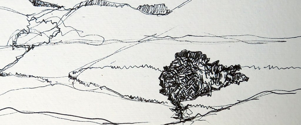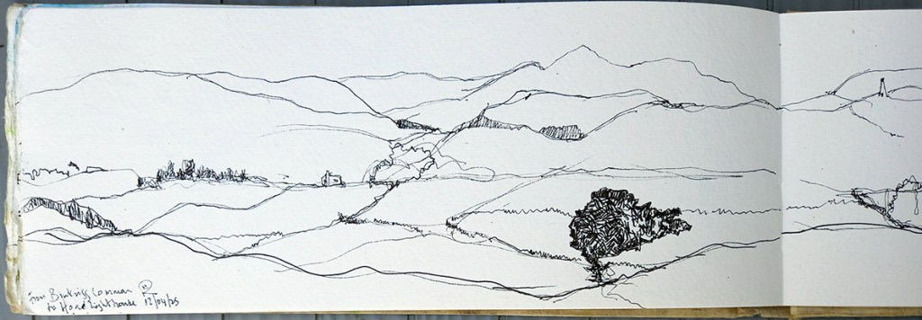 It was a lovely warm and sunny day on Birkrigg Common in the Lake District earlier this month and I sat and I scribbled for a while. I used a Faber Castell Pitt pen into my Khadi Landscape sketchbook. On the upper right of the drawing is the Hoad Lighthouse, a famous landmark around these parts. I like to draw across the centre of the book to get a panoramic view. I’ll post the rest of the sketch tomorrow.