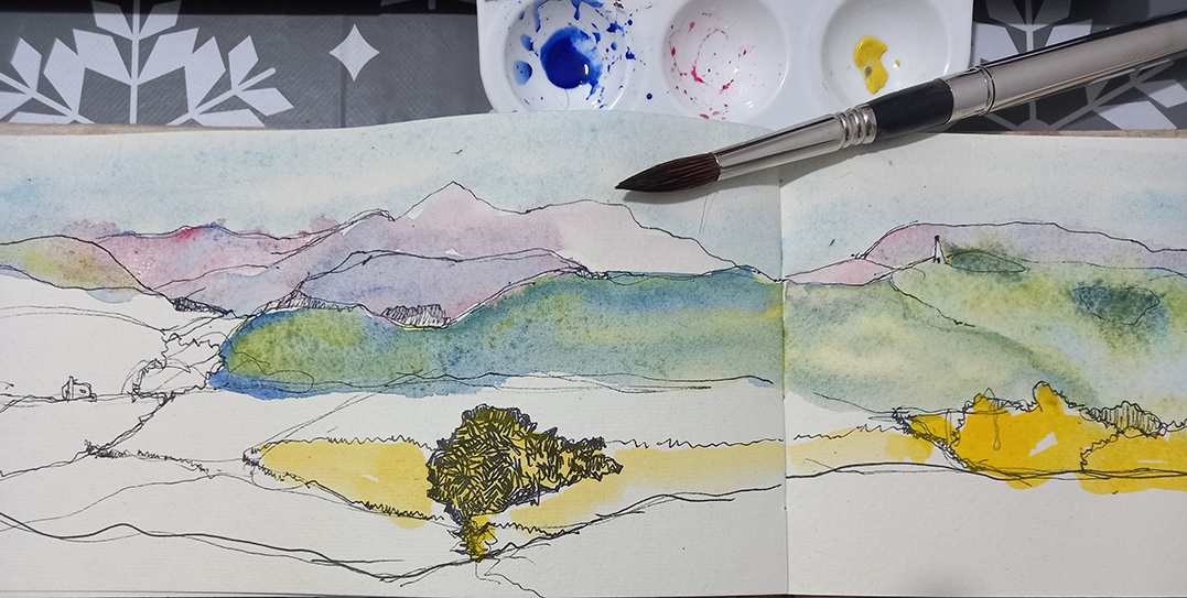 Here’s what I decided to do with my Birkrigg Common sketch that I posted yesterday (with the Hoad Lighthouse above Ulverston in the background). I did a few of these linear sketches on my recent holiday and I’m working into this one with some watercolour washes. I like blending watercolours directly onto the paper (Khadi). Plenty more to come.