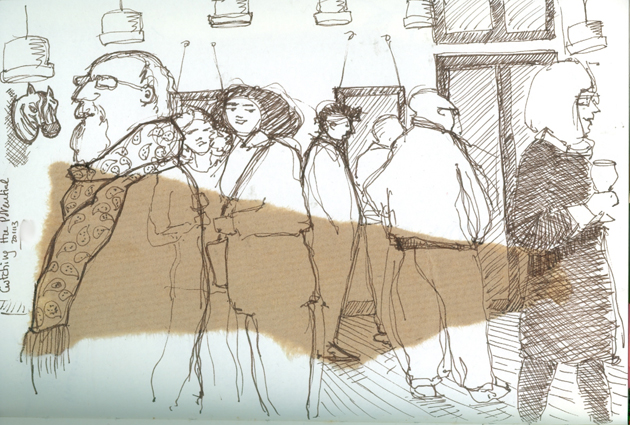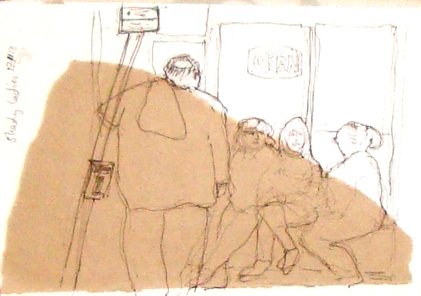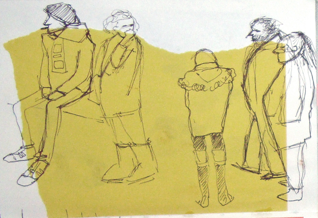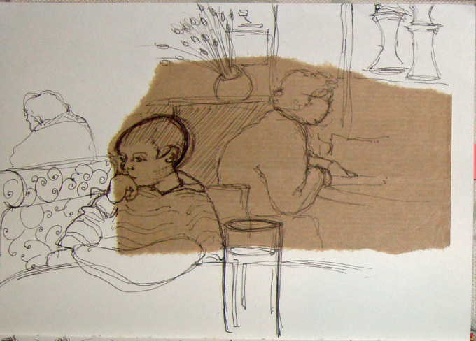 Some of my output from November 2013, when I routinely pasted brown parcel paper into my sketchbooks, I liked the way that the random shapes interacted with the line drawings.