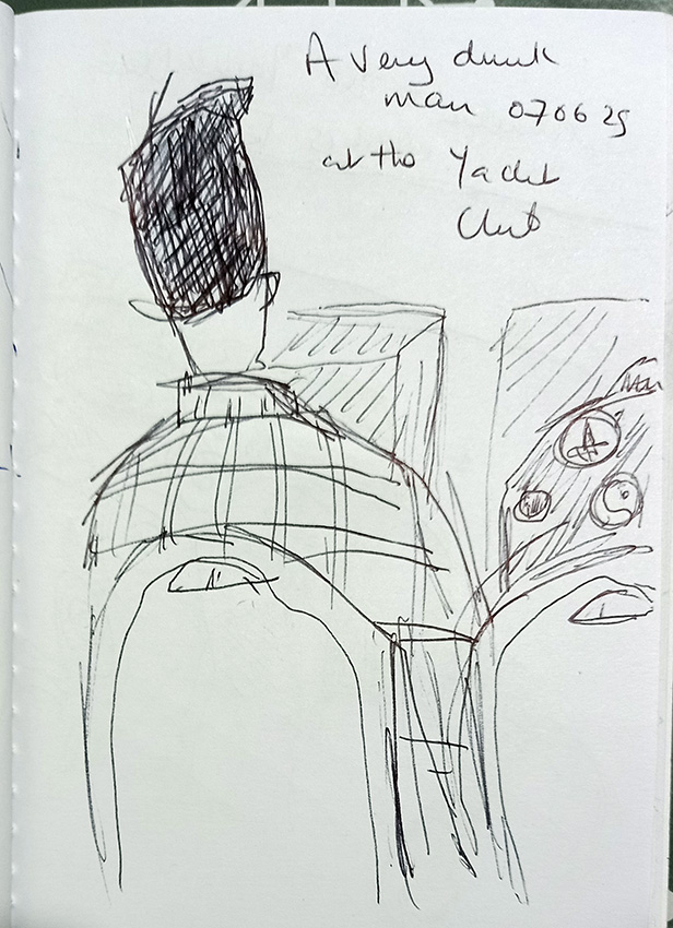 Husb and I were gallivanting again last evening. That’s a great word, my Nana and her generation would use it all the time, but it seems to have fallen out of use. I think it’s time it came back. Anyway, we were out gallivanting at a gig, so I had to have a scribble, didn’t I? It took me a couple of minutes. This was a very drunk man in a hat.