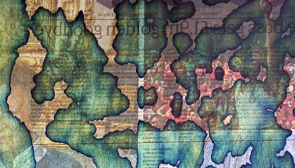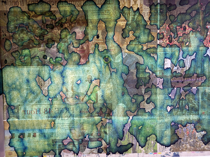 I was down at Swansea Print Workshop for an hour or so today, preparing some Bockingford paper with cyanotype chemicals for new work I hope to do this weekend. There was a fair bit of the solution left over and I happened to have some white cotton cloth with me, so I soaked the cloth in the chemicals and laid the pieces out to dry on top of layers of newspaper. When I took the dry cloth off, the newspaper was covered with random patterns of cyanotype solution which immediately started changing colour in the light. I snapped a few digital photos quickly, before they darkened (they’re very dark now). I like them, they’re fun, and I also like that the images are ephemeral and now only exist in the digital world. It was a very happy accident. I don’t know what I’ll do with the images, but they’ll go into the mix and come out at a later date no doubt.