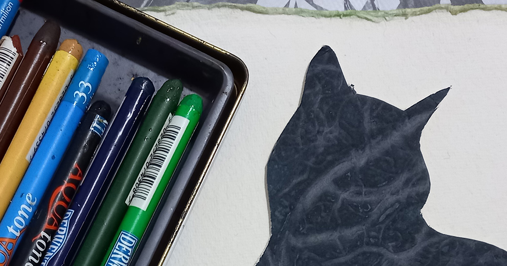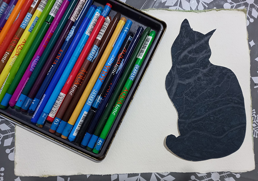 Someone gave me some slightly used Derwent AQUAtone watercolour sticks to try out (they’re now discontinued). I have a sheet of Khadi handmade paper. And I have a stencil in the shape of our little rescue cat Bill aka William Chatnoir. I’m planning to have some fun here.