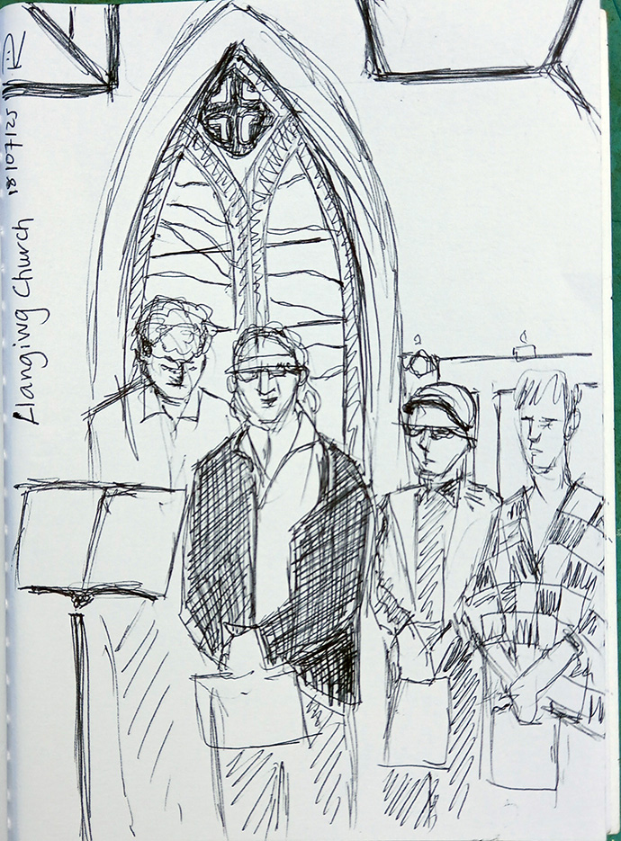 Husb and I went to an unusual place for a gig on Friday night, a church! Llangiwg Church is a fascinating place, very ancient with a huge yew tree alongside, which indicated it may be built on an earlier Celtic holy site. There’s also a stone-lined healing / holy well in the grounds and spectacular views over the surrounding countryside. The tower is a solid Norman square stone block and it’s on top of a very steep hill, on it’s own, away from the noise and bustle of daily life. So quiet. Of course, I had to have a scribble!