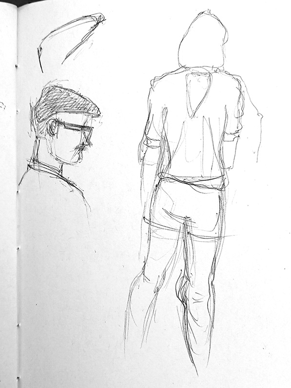 It seems that flat hats are back. I always associate flat caps with old blokes, but now that I’m old, it’s a bit of a surprise seeing young men wearing them. Yes, it’s a young man in my sketch but the flat hat and moustache (also making a comeback apparently) that make him look older. What goes around comes around. Scribbled recently at Elysium during an evening of funky rap.