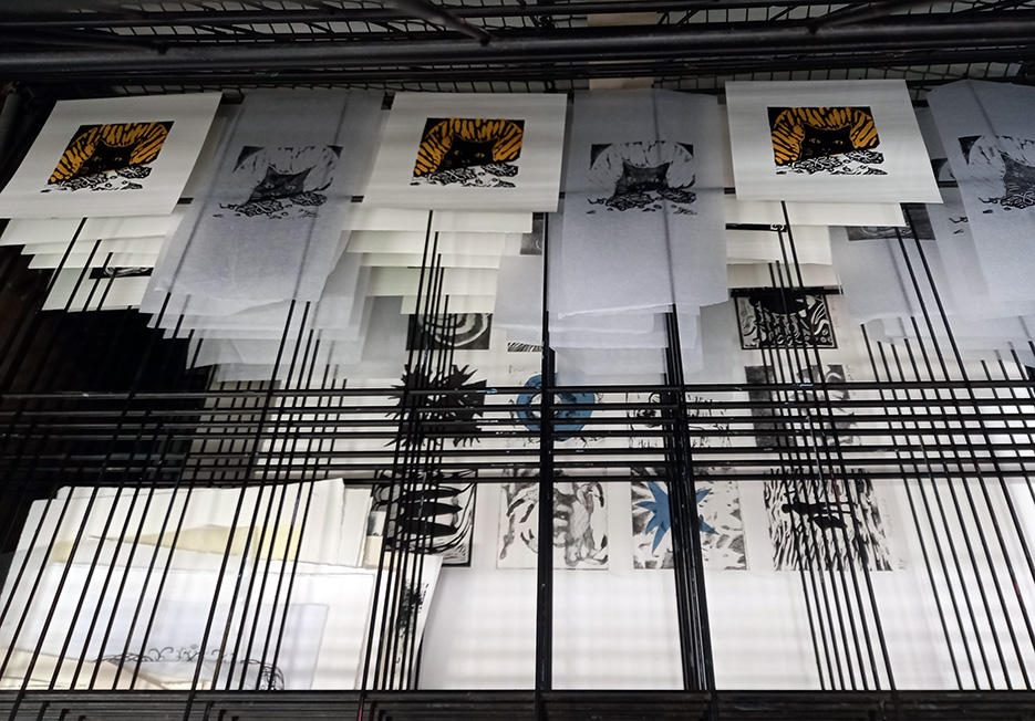 Here are some of my little linocuts on the drying rack at Swansea Print Workshop. I’ve printed the block, “Should Bill Get Some Bacon?”, with a golden yellow mulberry paper as chine collé but I also took secondary, or “ghost” prints each time onto tissue paper to prevent the build-up of ink on the block. The little ghost prints are quite sweet in their own right.