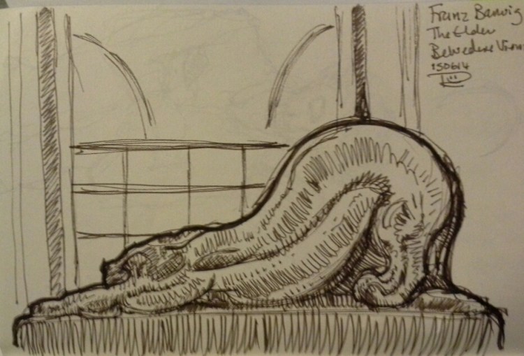 Here’s a drawing from June 2014, when Husb and I visited the Belvedere Gallery in Vienna. I saw this wonderful sculpture of a cat by Franz Barwig and scribbled it.