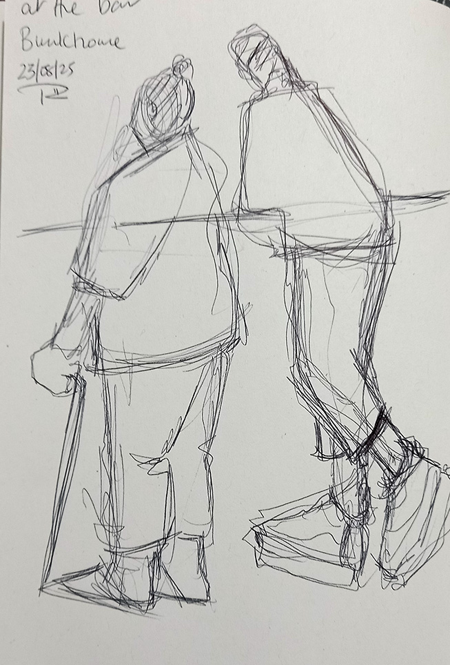 A couple of backs at the Bunkhouse in this little scribble. Husb and I were there over the weekend, it’s a good venue. The man had HUGE trainers.