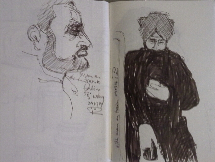 It’s archive time again, from March 2014. Here are 4 sketchbook scribbles and a sketch on newspaper that I did at a “live” drawing session.