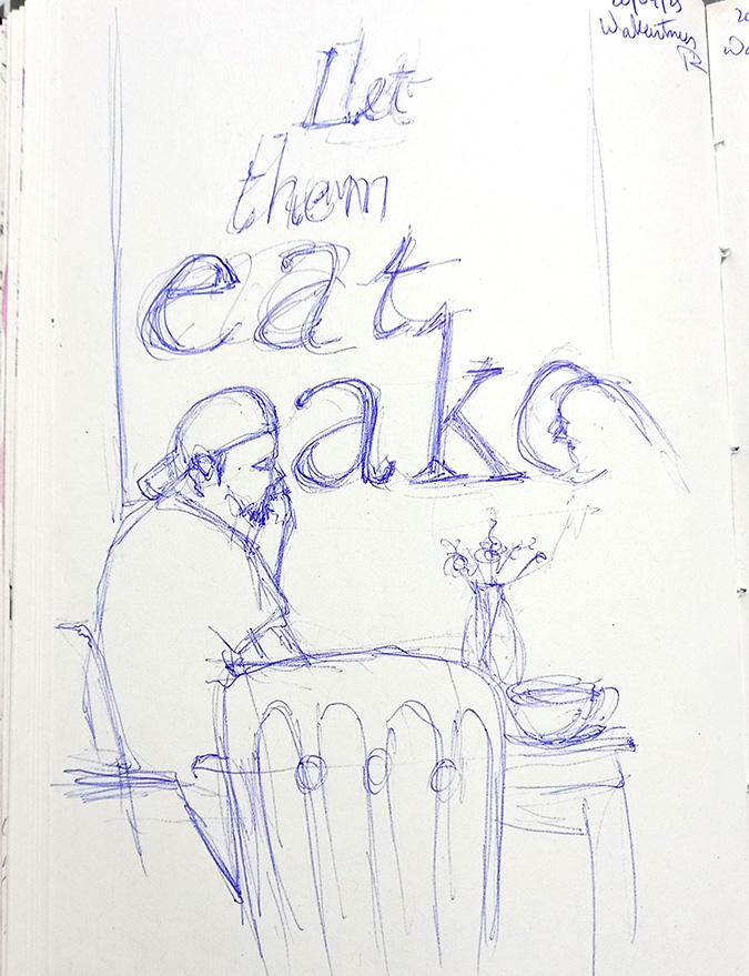 I scribbled this in Waterstone’s café the other day. I liked the signage on the wall and the chap taking tea beneath it. I started to draw his companion, but they upped and left. How rude!