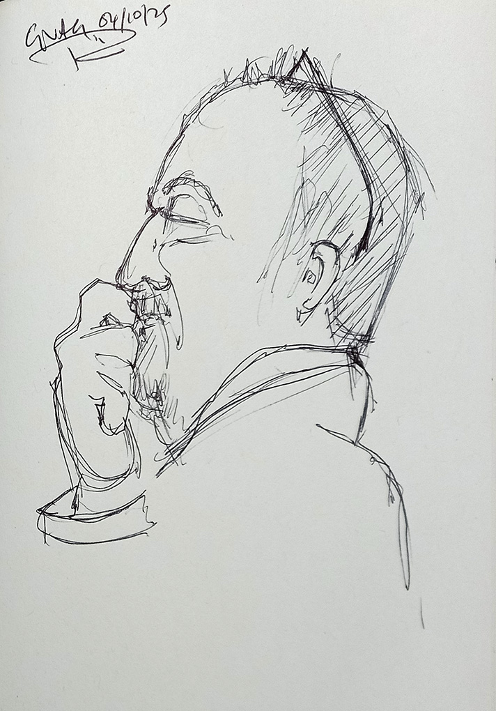 I went to an illustrated talk by Andrew Renton at the Glynn Vivian Art Gallery yesterday, part of the excellent Tigers and Dragons exhibition. It was dark as the projector was on, but I had a scribble anyway. It’s good practice to draw in varying degrees of light and dark, I think. This guy was really absorbed in the talk, it was very interesting.