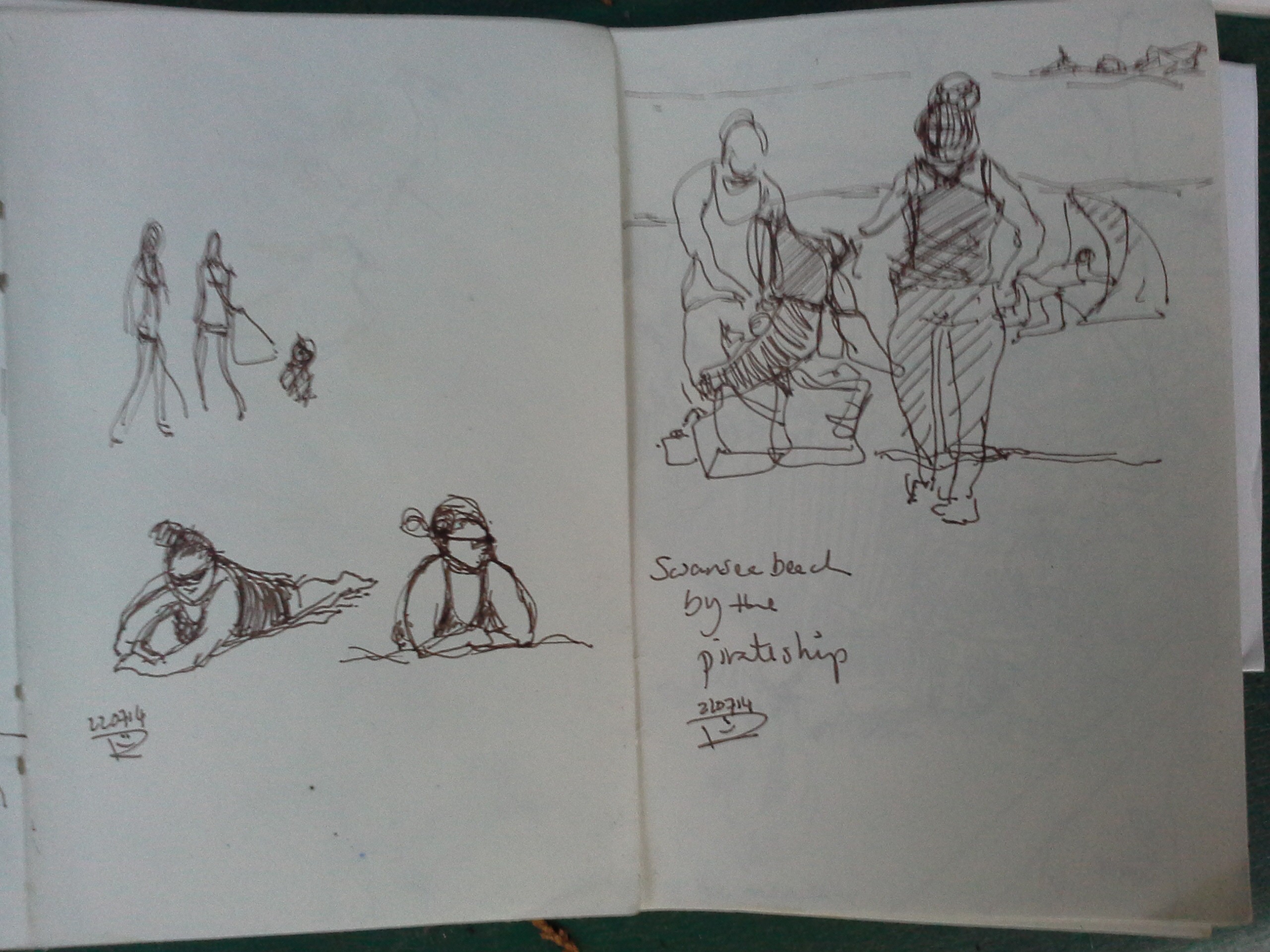 I guess that July 2014 was a hot summer month going by all the sketches I did of people on the beach. The slightest bit of sunshine and we’re off down to Swansea Bay in our swimming cozzies. There were a fair few beer bellies and unfortunately a few “Budgie Smugglers” (Speedo men’s swimming trunks) as well!