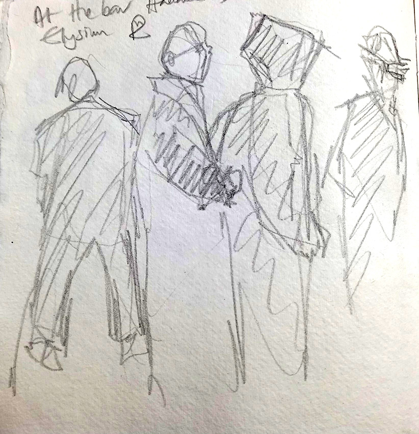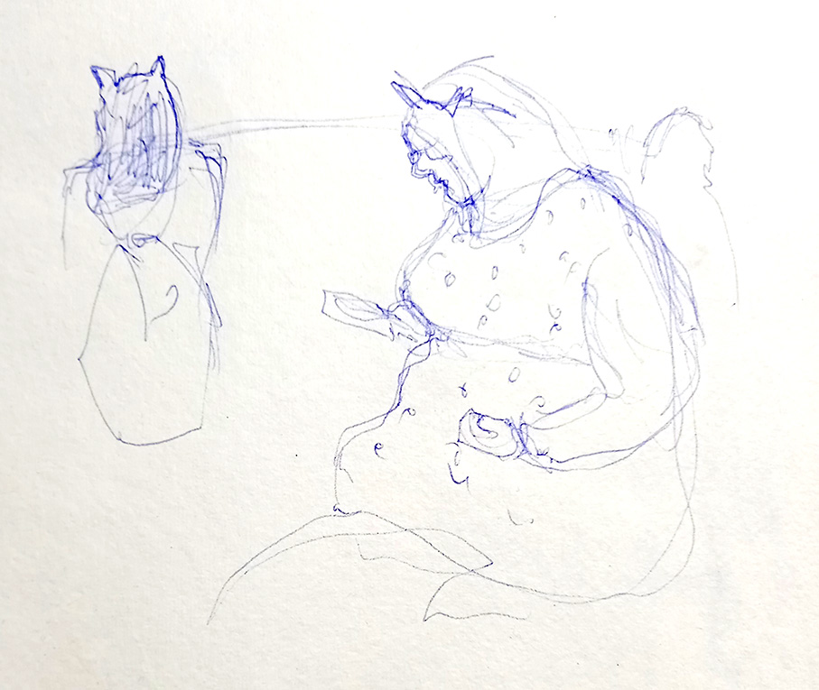 These are the first two scribbles I did in my sketchbook on Samhain / Halloween. I should have posted them first, I guess, not last. It takes a while to warm up so I usually do a couple of very quick ones at the start of a session.
