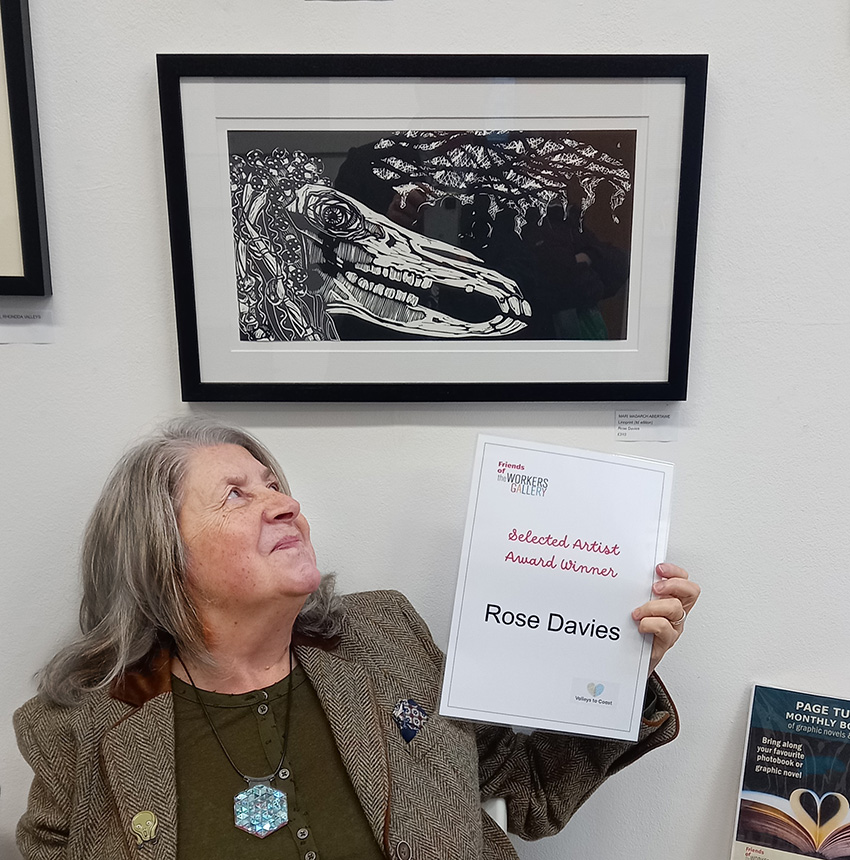 Today was brilliant. Today made me feel like all these years of plugging away at my arts practice is worthwhile. Today I won a prize at The Workers Gallery Open (in Ynyshir) and the GSA 9to90 Open (in Swansea). The Workers Gallery has awarded me a voucher for art materials and a gallery show towards the end of 2026, for my linocut “Mari Madarch Abertawe” (above).