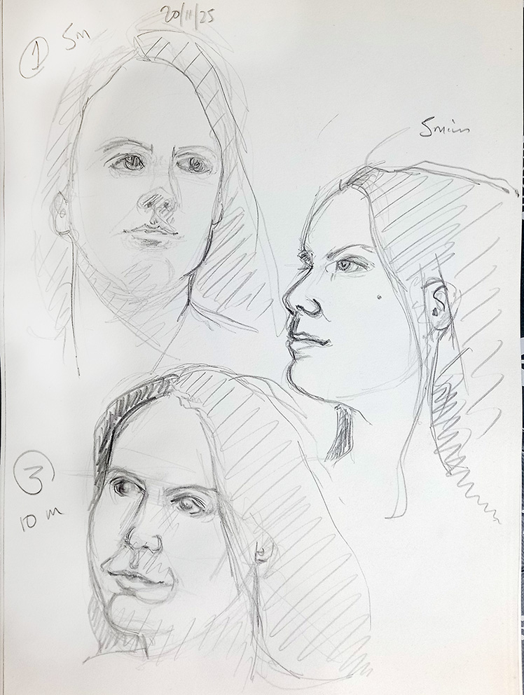I’m into week 5 of my return to life drawing at Swansea Print Workshop after a long, long gap (see here). I’ve set myself a goal to improve my portrait drawing over the next year. Here are my warm-up sketches with a new model, two x 5 minutes and one x 10 minutes. I’m using a graphite block onto a cheap cartridge paper for the warm-ups.