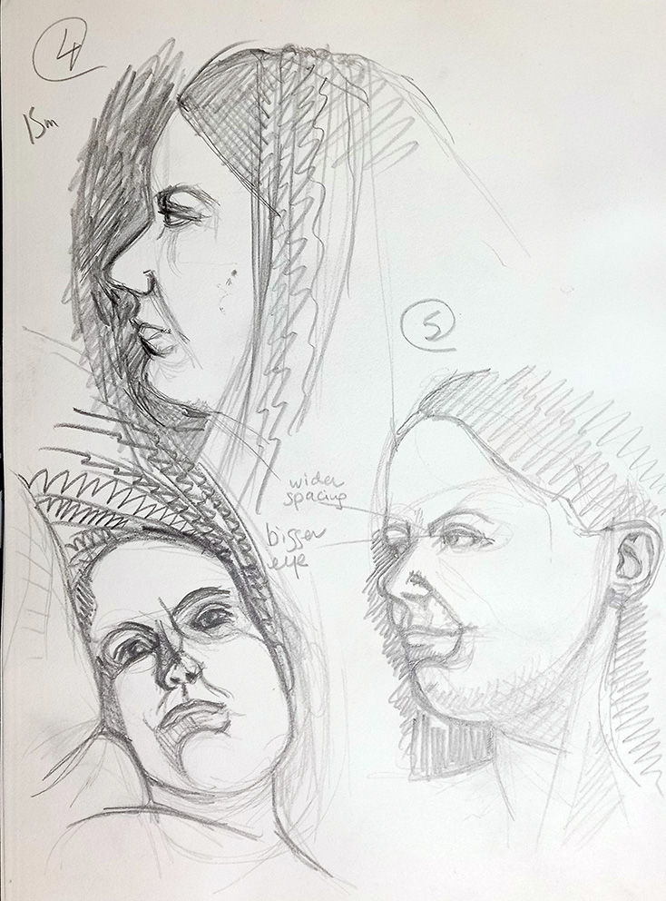 Here’s the middle set of drawings I did with the new model, 2 x 15mins and a half-hour pose. I scribbled some notes while I analysed the sketches, to learn for the next one. Accurate drawing depends on accurate analysis, seeing what’s there, not what I think is there. Her eyes are very wide-spaced and quite large. She’s lying down in the bottom left, that’s why her face looks a little bit squished.