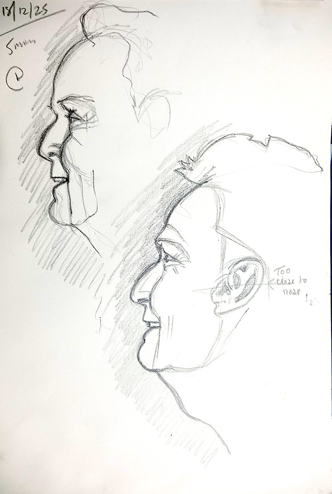 It’s 8 weeks since I started back at life drawing at Swansea Print Workshop after a long break (see here) and here are the warm-up sketches. I’m aiming to improve my portrait drawing over the next year. These are 5 minute sketches, using a graphite block onto a good quality but cheap cartridge paper. Sometimes I make notes when I notice something that needs to be corrected, like I have a habit of placing the ear too far forward on the face when I’m drawing a profile.