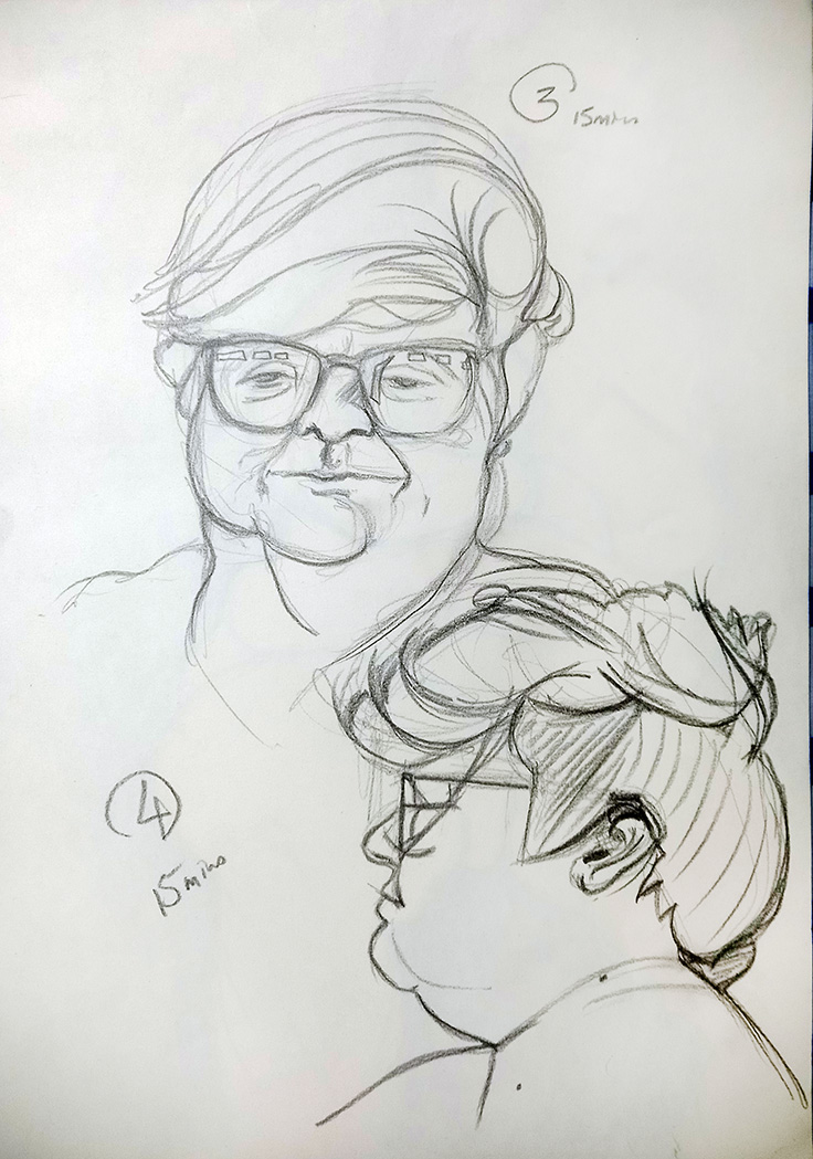 The middle poses in my last life drawing session, 15 minutes each, are when I start to focus and concentrate. I’ve done the warm ups to get the gist of her face, so now I’m really looking at the structure, proportions and details.