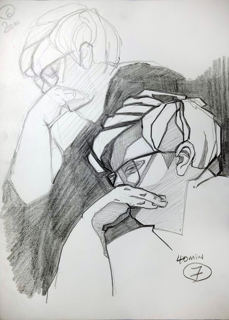 This was the final pose for the final hour at the recent life drawing session at Swansea Print Workshop. I’d familiarised myself with the model’s face with a series of quick sketches ranging from 5 to 30 minutes. Then I had an hour to play with this pose. I did a 20 minute sketch (top left) then I decided I wanted to change my drawing style and do something more sculptural which took up the last 40 minutes. I think there’s scope to turn this into a linocut – watch this space…
