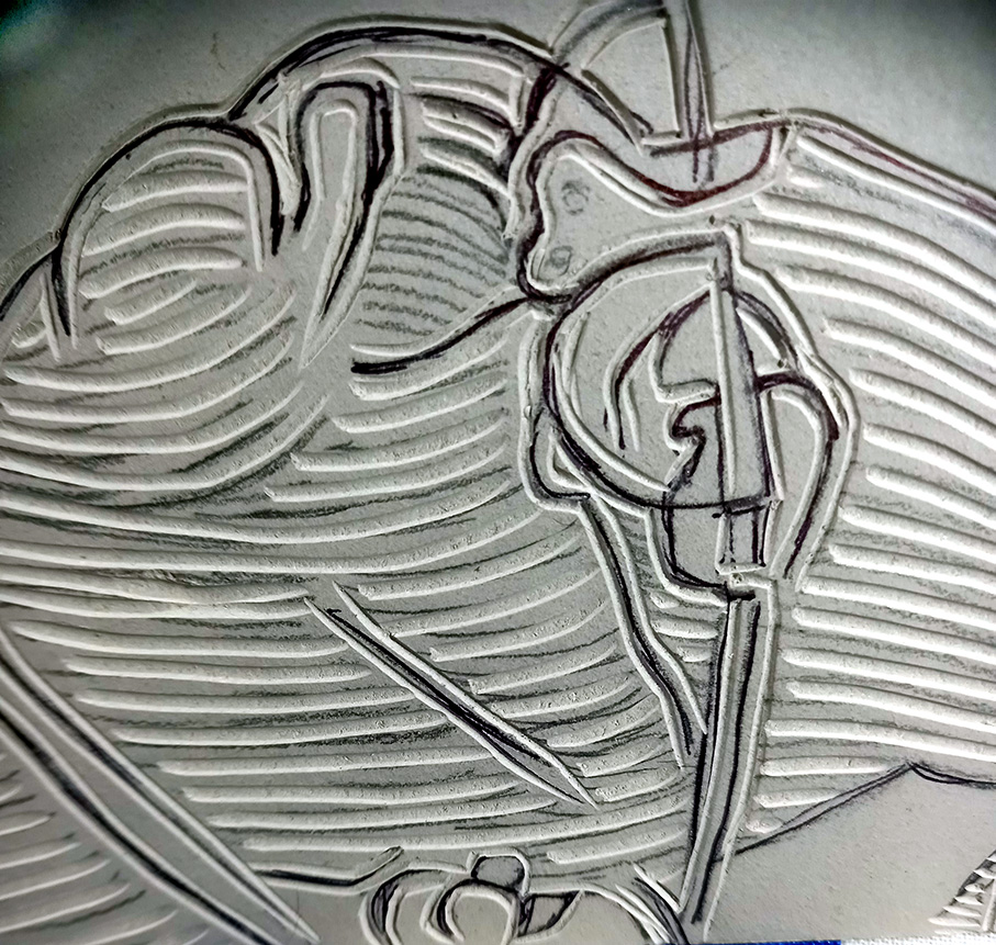 I had to make some decisions today on how I would represent the skin in my portrait. I had cut around the main line drawing, I’ll refine it later, but the question then is do I carve out the main area of skin or not? The model has darker skin so I didn’t want to use a technique that would make her skin look white. I thought of a life drawing lesson I had way back when I was in Swansea Art College, back in the 1970s. My wonderful lecturer, Glenys Cour, asked us to look at the body as if it was a geographical feature and then draw contour lines over it, to show the rises and falls. So I got myself a pencil and drew onto my lino portrait and then cut the lines. I won’t know if it will have worked until I get to print it, which should be in the next few days.