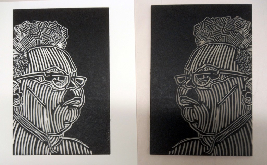 I did a first proof of my new linocut portrait this week. I did as much carving as I thought necessary, following my decision to almost treat the flesh like a geographical feature (see here), and decided to print one to see what I had. I’m not 100% happy with it but I think I’m on the right track and looking forward to continuing to work with this model.
