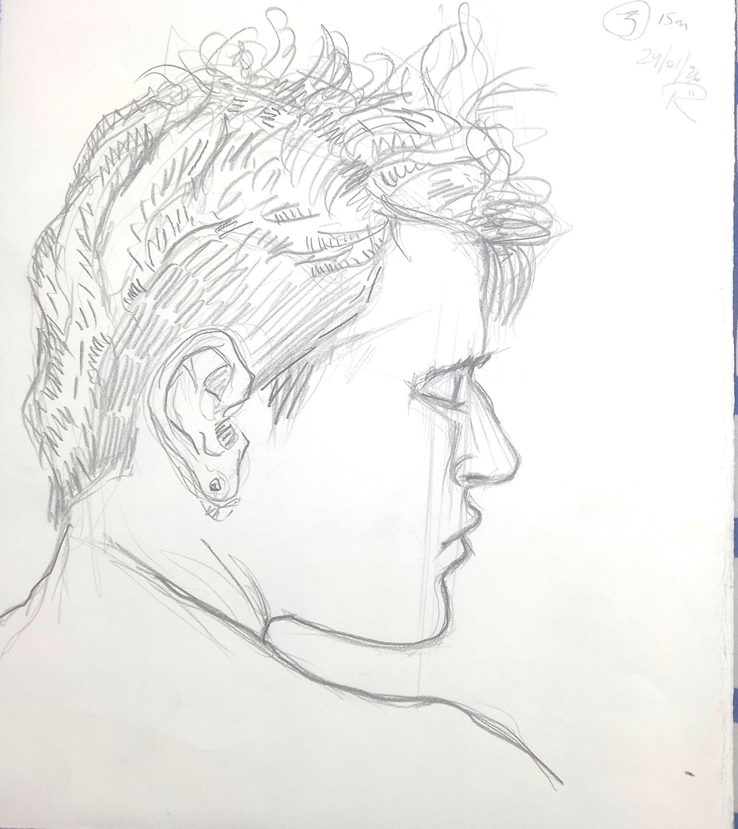 This is a slightly longer, 15 minute pose at last week’s life drawing session at Swansea Print Workshop. I had a great view of his profile and I concentrated on the quality of the lines I was making. I really like this, I think it’s very sensitive and I might develop this in some way. I used a graphite block onto a piece of Zercoll 145gsm paper.