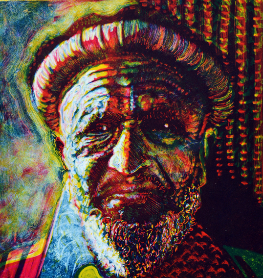 Almost 20 years ago, I paid my first visit to Pakistan and was blown away by how beautiful and friendly it is. I did loads of sketches and photos and when I came back home, I used these as inspiration for new artwork. This portrait of a man from the Hunza Valley is done using the three-colour separation monotype technique; I learnt it from USA printmaker Vinita Voogd – you can see more of her work here.
