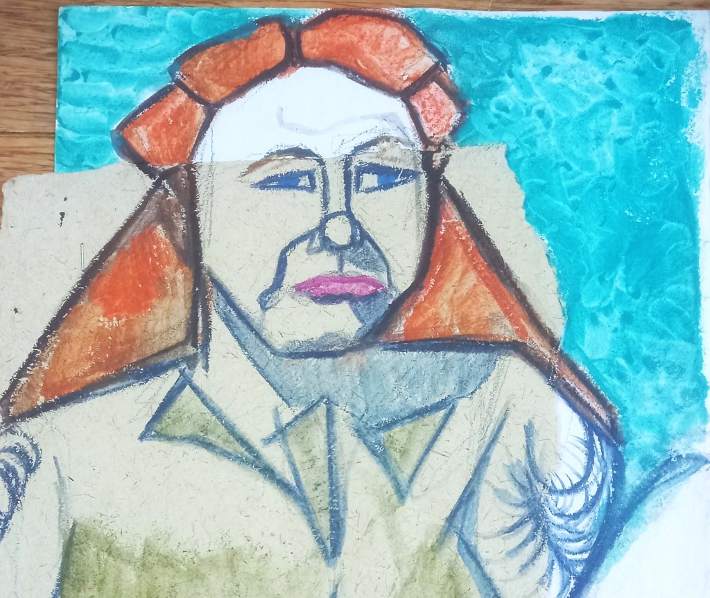 Following on from yesterday’s post, here’s another recent life drawing in colour, instead of my normal black and white. I’m going to try and do at least one colour drawing each session. I’m using Derwent Inktense blocks here onto a heavyweight white paper partly overlaid with a brown speckled Mulberry paper.