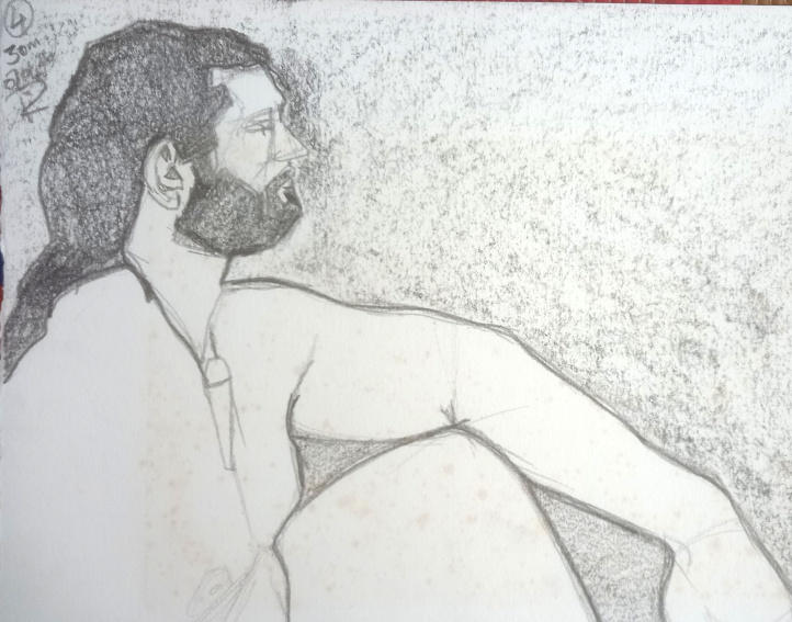 Last week at life drawing group I really enjoyed drawing this 30-minute pose. The model looks quite pensive but I think that’s just how he looks when he’s holding a pose for half an hour – it’s not easy being a life model. I spent a lot of the time working on his face, analysing the proportions and angles using a 2B graphite block. It’s not a bad likeness but could be better. His pendant is part of an ancient mammoth tusk.