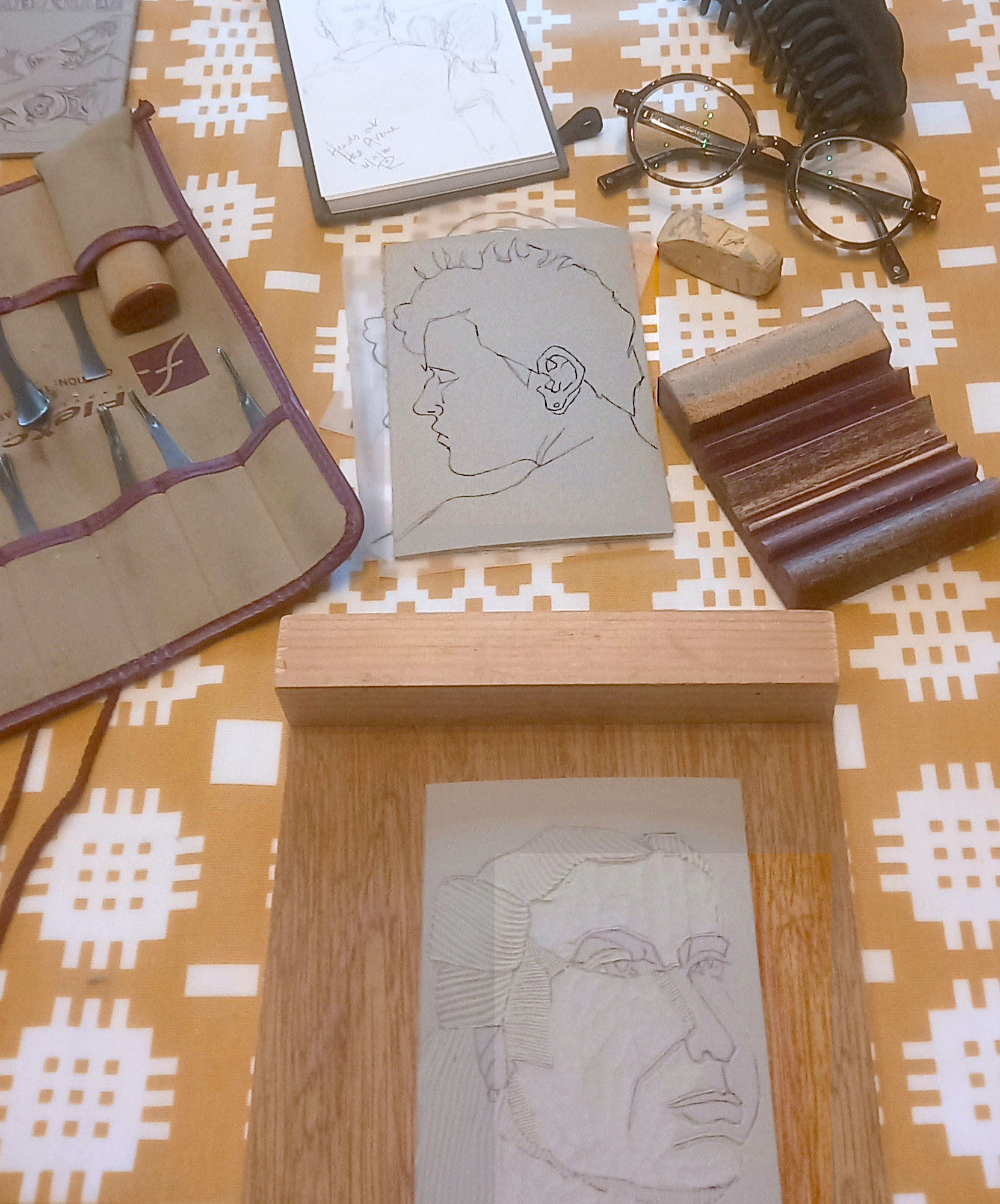 This is the reality of being an artist, you have to make your art and that involves day after day of repetitive slog. There’s no getting around it unless you want to go down the A.I./ laser cutting/ digital printing route, and I certainly don’t. So Day 4 of my residency at Urban HQ in Swansea, I carried on carving lino blocks. I’ve been practicing portrait drawing at the life drawings sessions at Swansea Print Workshop and now I’m practicing making the sketches into lino block prints.