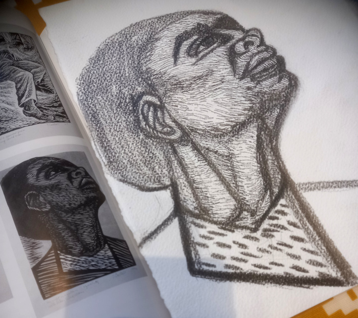 Part of an art practice is research. so I set myself to it on Day 7 of my residency at Urban HQ in Swansea. I’d been having some problems trying to represent dark skin through lino printing so I turned to my book* on the African-American artist Elizabeth Catlett. She was a prolific printmaker, as well as sculptor, and I sat and studied her linocut portraits, how she made her cuts, what marks she made into the lino. Of course, it’s not the same, drawing with graphite and black pen onto white paper, instead of carving into lino, but by studying and drawing her image, I learnt so many lessons that I hope to carry into my next lino block. Some people think it’s quite old-fashioned to study from great artists, but I always say, learn from the best!