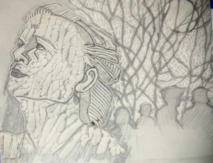 I’m chuffed with the amount of work I have done so far during my residency at Swansea’s Urban HQ. In 10 days I’ve cut 12 lino blocks, done a day of research, had really good conversations with about 30 visitors, and sold a little linocut print. This block is number 12 and is double the size of all the others, it is 20 x 15cms. I was going to make it just a straight portrait, based on an original life drawing, but once the carving on the face was finished I decided to add some background, some shadowy figures and silhouetted winter trees. Why not, eh?