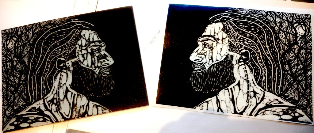 It’s the last-but-one day of my artist residency at Swansea’s Urban HQ and I did a first proof of the last block I carved, block number 12. I started out on April 1st with a pile of portrait sketches, done from life, a stack of traditional grey lino blocks and my carving tools. I’m really pleased with the way it’s gone, next step is to look carefully at all the first proofs and decide which ones need more work. The mouth in this one could do with a bit of tweaking, we’ll see.