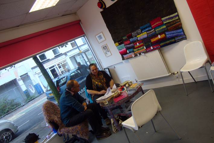 Previous Image Next Image cb23 1c Guest artist Jacki Phillips showing her knitting research to a visitor