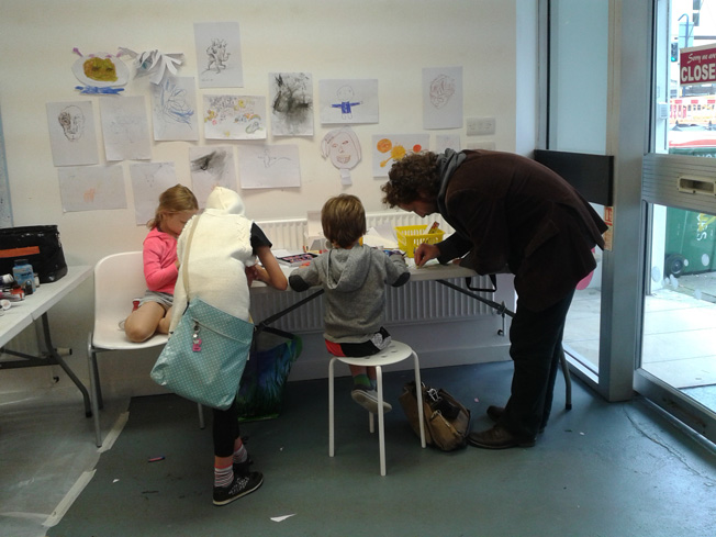 Adults and children wander in to do art