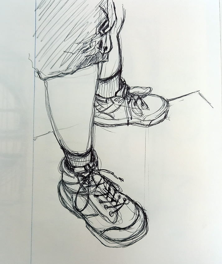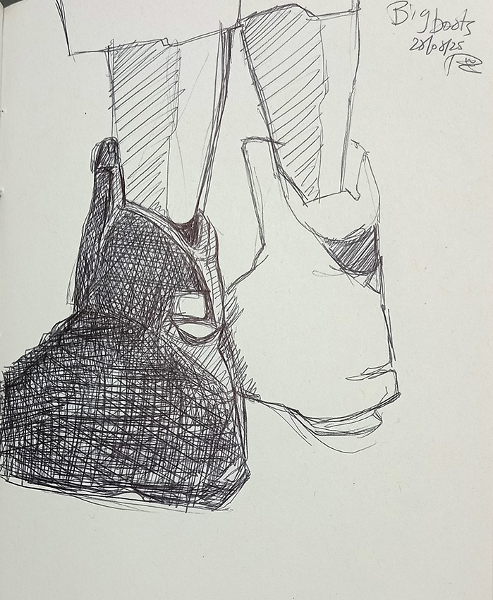 A couple of backs at the Bunkhouse in this little scribble. Husb and I were there over the weekend, it’s a good venue. The man had HUGE trainers.