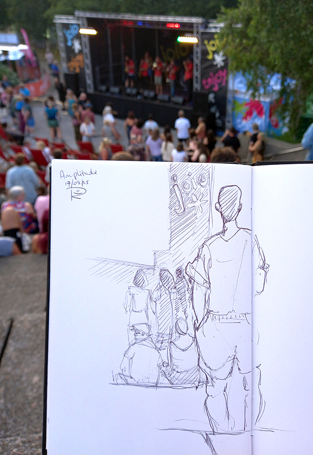 Husb and I went to the Amplitude music festival in Swansea this evening, a free event put on by Swansea Council as part of it’s “Joio! Enjoy!” summer programme. The aim of the festival is to give local talent a chance to reach new audiences. It was fab and I had a scribble, of course. The band on stage is the irrepressible Disco Panther, soooo funky!!! Catch them if you can.
