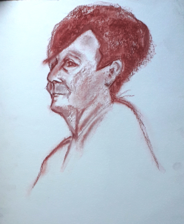 I thought I’d do a portrait at last week’s life drawing session. It’s good practice to try and get a likeness as well as a half decent drawing. Our model is a very striking looking person and is really interesting to draw, sculptural. I used sanguine and white conte crayons onto a slightly textured paper.