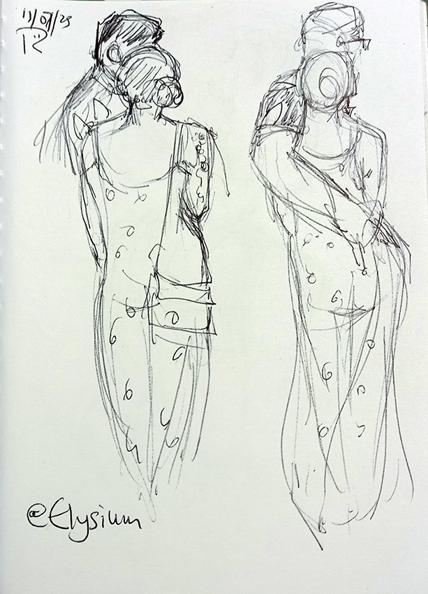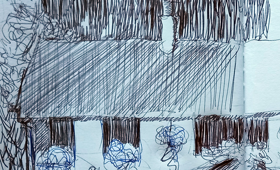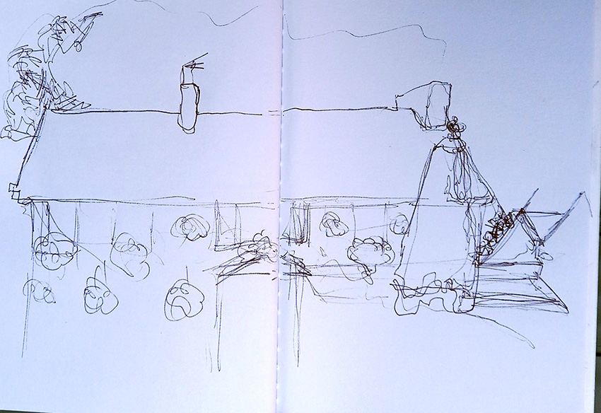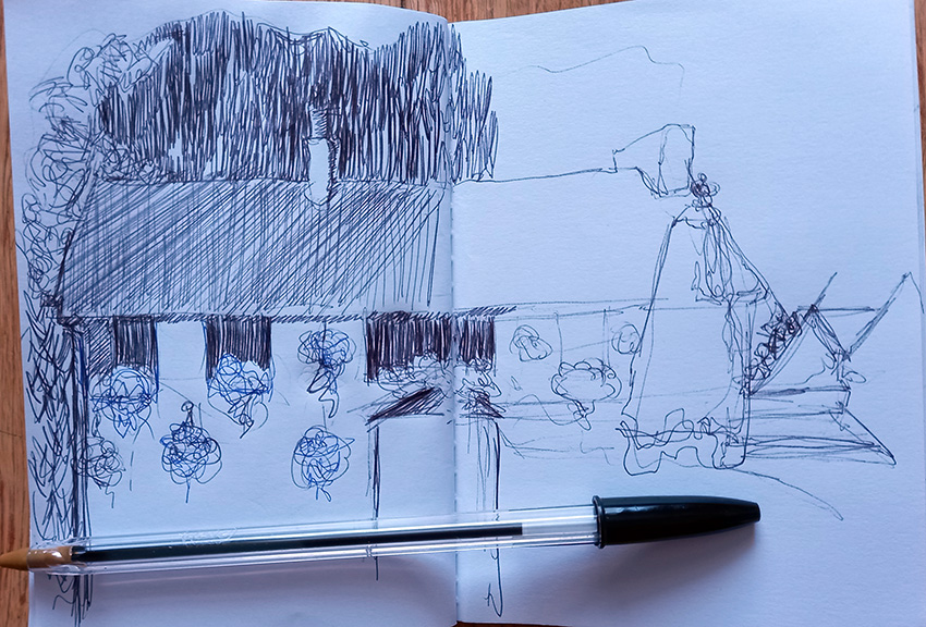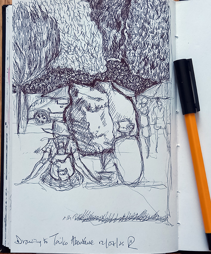 Husb and I went to an unusual place for a gig on Friday night, a church! Llangiwg Church is a fascinating place, very ancient with a huge yew tree alongside, which indicated it may be built on an earlier Celtic holy site. There’s also a stone-lined healing / holy well in the grounds and spectacular views over the surrounding countryside. The tower is a solid Norman square stone block and it’s on top of a very steep hill, on it’s own, away from the noise and bustle of daily life. So quiet. Of course, I had to have a scribble!