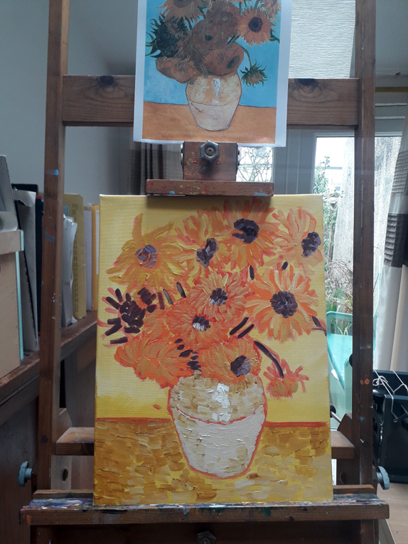 Husb and I had an arty morning today. I carried on working on two of the paintings I’m copying at the moment and Husb did some more on his self-portrait. I’ve been doing copies every week with Ed Sumner’s Cheese and Wine Painting Club on Facebook for almost a year now and Husb began his selfie a couple of weekends ago in a Zoom tutorial with the 9to90 Creative Community at GS Artists in Swansea.