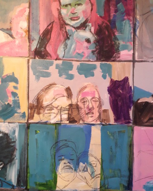 I carried on with my big painting today, working in more of the building blocks of the images. Some of them are pretty spot on but some are really difficult to do as I can’t get my head around the distortion caused by the computer screens and I’m falling into the trap of painting what I think is there, not what is actually there. I’m getting better at it though. I didn’t stop to think how big a task this would be when I started but today I added up all the figures – 17 people, 2 dogs and a cat. Talk about throwing myself in at the deep end. I’m using Liquitex Heavy Body acrylic paint onto stretched canvas, with willow charcoal to sketch in the details.