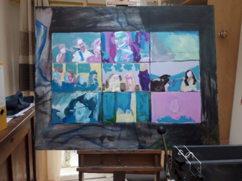 I carried on with my new big painting today, it’s slow work, there will be many more layers of paint. It’s going to be about our family Zoom quiz that we have every week, since early in the first lockdown. The quiz connects family across South Wales, Cumbria and Australia and it’s so brilliant. I’ve taken screengrabs of the Zoom sessions to work from but the colours are so weird and I want to keep that weirdness in the final painting. I love it but I’m not sure my family will 😀 I’m using Liquitex Heavy Body acrylic paint onto canvas.